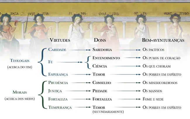 São Tomás de Aquino estabelece uma interessante correspondência entre as virtudes infusas, os dons do Espírito Santo e as bem-aventuranças evangélicas. A virtude da caridade, por exemplo, é aperfeiçoada pelo dom de sabedoria, que nos inclui no número dos pacíficos, merecedores de serem chamados filhos de Deus (cf. Mt 5, 9). A esperança, por sua vez, aprimora-se pelo dom do temor, que nos faz pobres de espírito, possuidores do Reino dos Céus (cf. Mt 5, 3). E assim por diante.