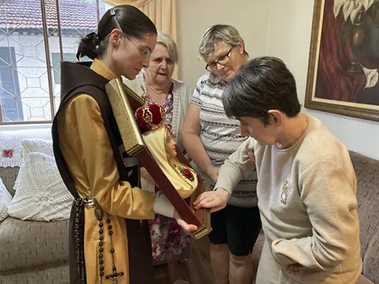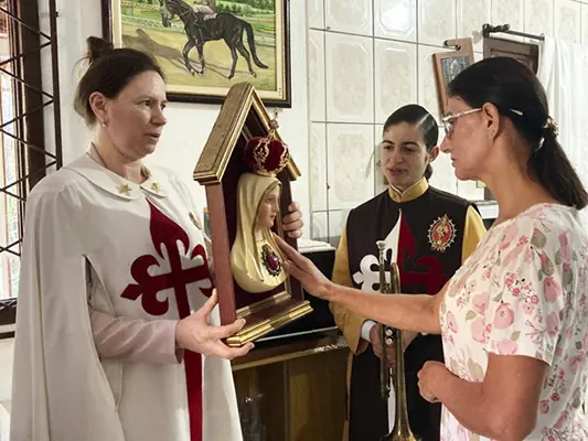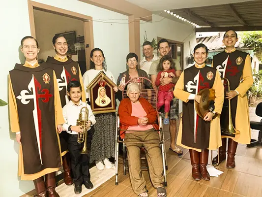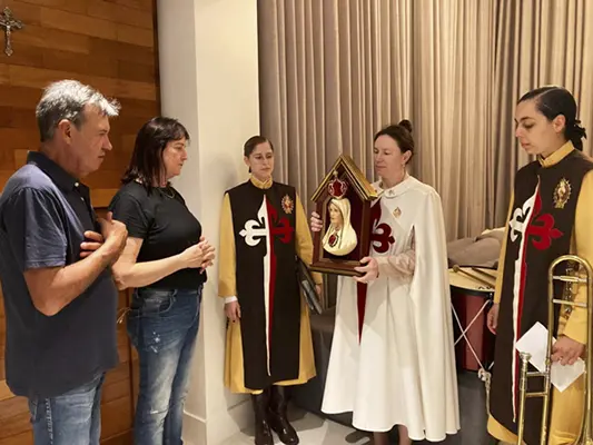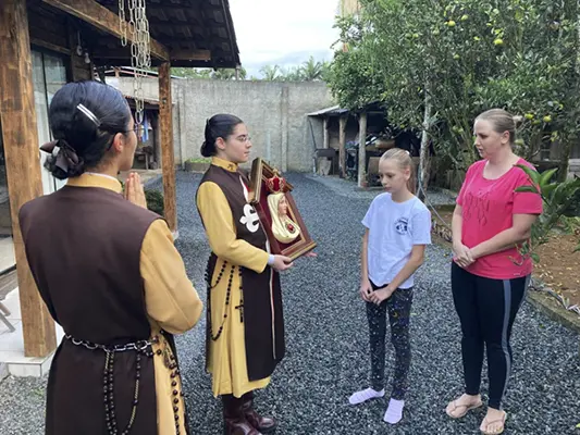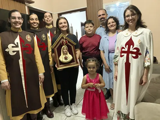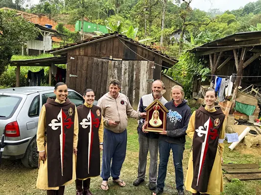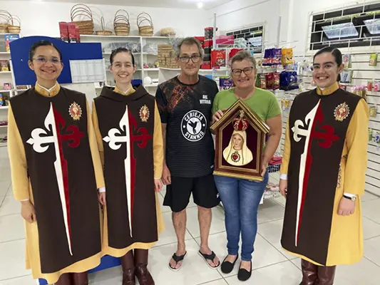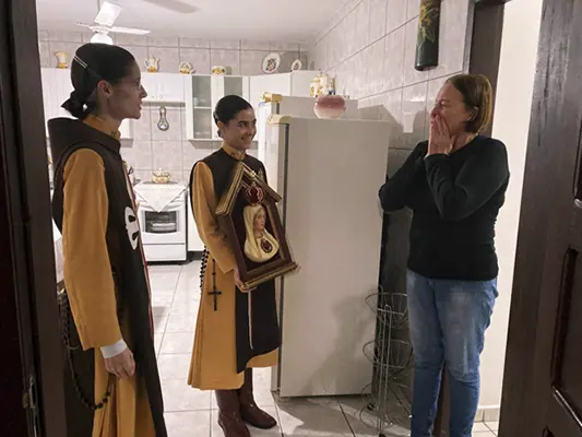 Jaraguá do Sul (SC) – Irmãs do setor feminino dos Arautos do Evangelhos realizaram uma missão mariana em cinco comunidades da cidade de Jaraguá do Sul, entre os meses de abril e junho. O Oratório do Imaculado Coração de Maria percorreu residências e estabelecimentos comerciais, levando as bênçãos da Mãe de Deus.
