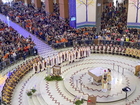 Os participantes do Apostolado do Oratório “Maria, Rainha dos Corações” reuniram-se no mês de agosto para mais uma peregrinação nacional ao Santuário de Nossa Senhora Aparecida. A programação se iniciou no dia 8, sexta-feira, na Basílica Velha, de onde partiu a procissão luminosa até o Santuário. No sábado, houve a solene coroação da imagem da Santíssima Virgem e a recitação do Terço, na Tribuna Papa Bento XVI, seguida da Santa Missa, presidida por Dom Benedito Beni dos Santos, Bispo Emérito de Lorena.
