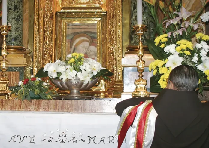 Diante do santo afresco ninguém pode ficar excluído da cena, como um mero espectador. Junto à Mãe do Bom Conselho só há uma posição a ser tomada: unir-se àquele Menino e deixar-se carregar por Nossa Senhora. Ou seja, fazer-se filho!